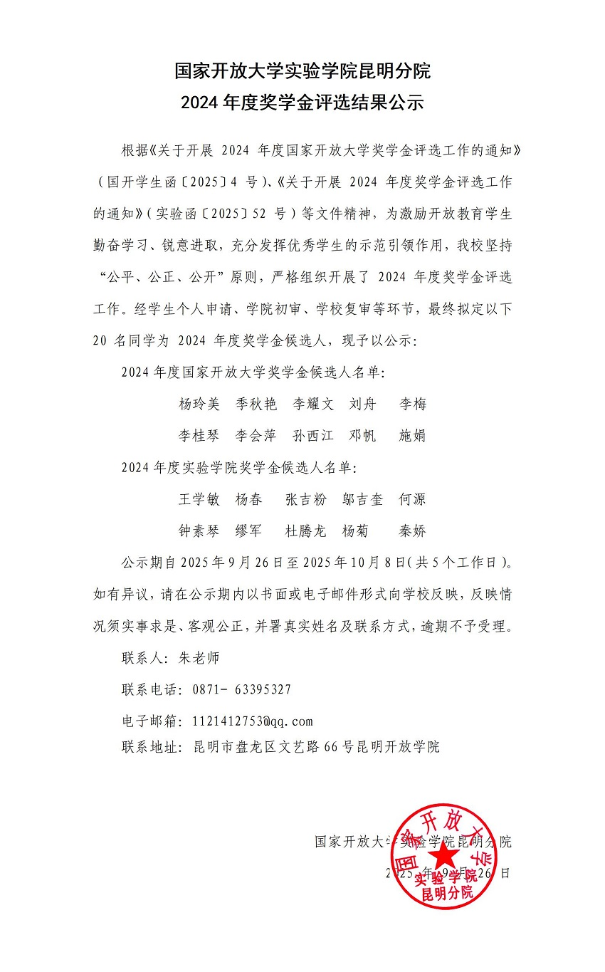 国开实验学院昆明分院2024年度奖学金评选结果公示