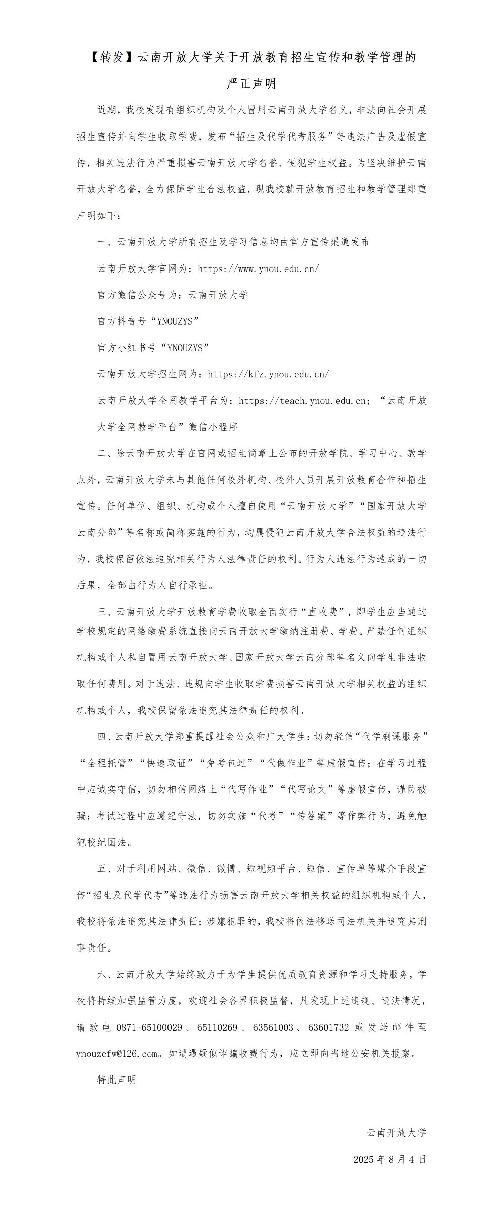 【转发】云南开放大学关于开放教育招生宣传和教学管理的严正声明