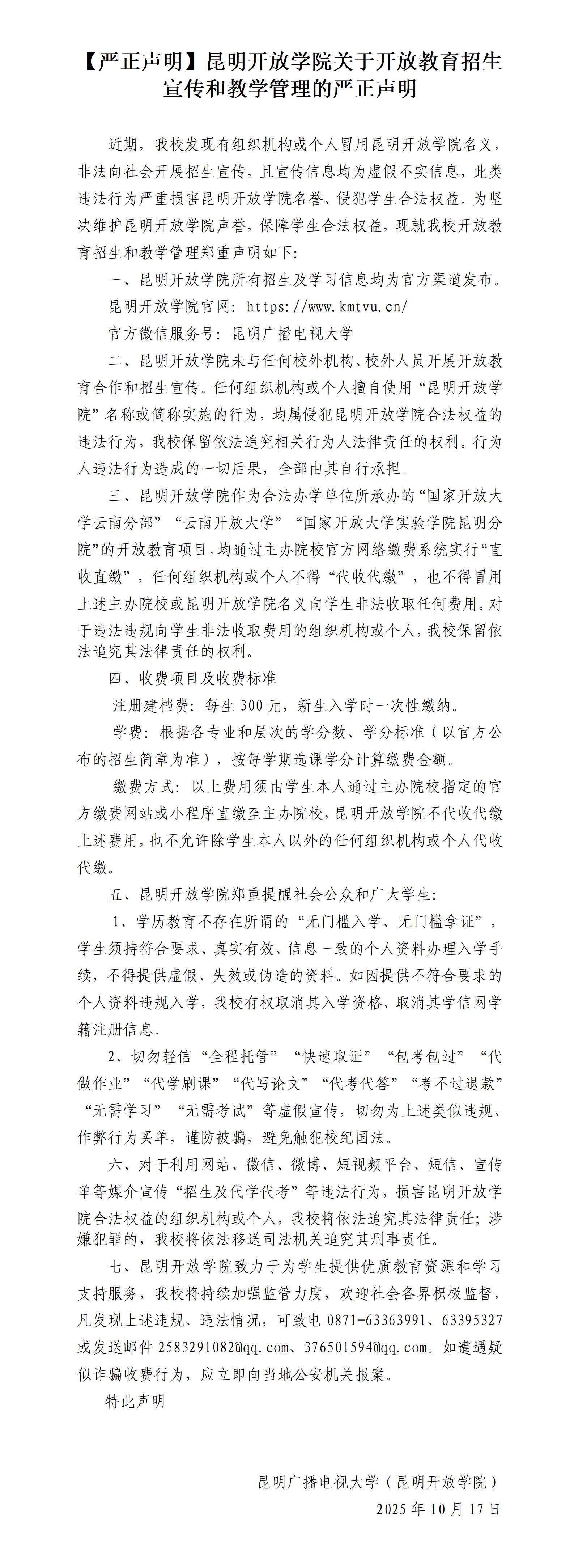 【严正声明】昆明开放学院关于开放教育招生宣传和教学管理的严正声明