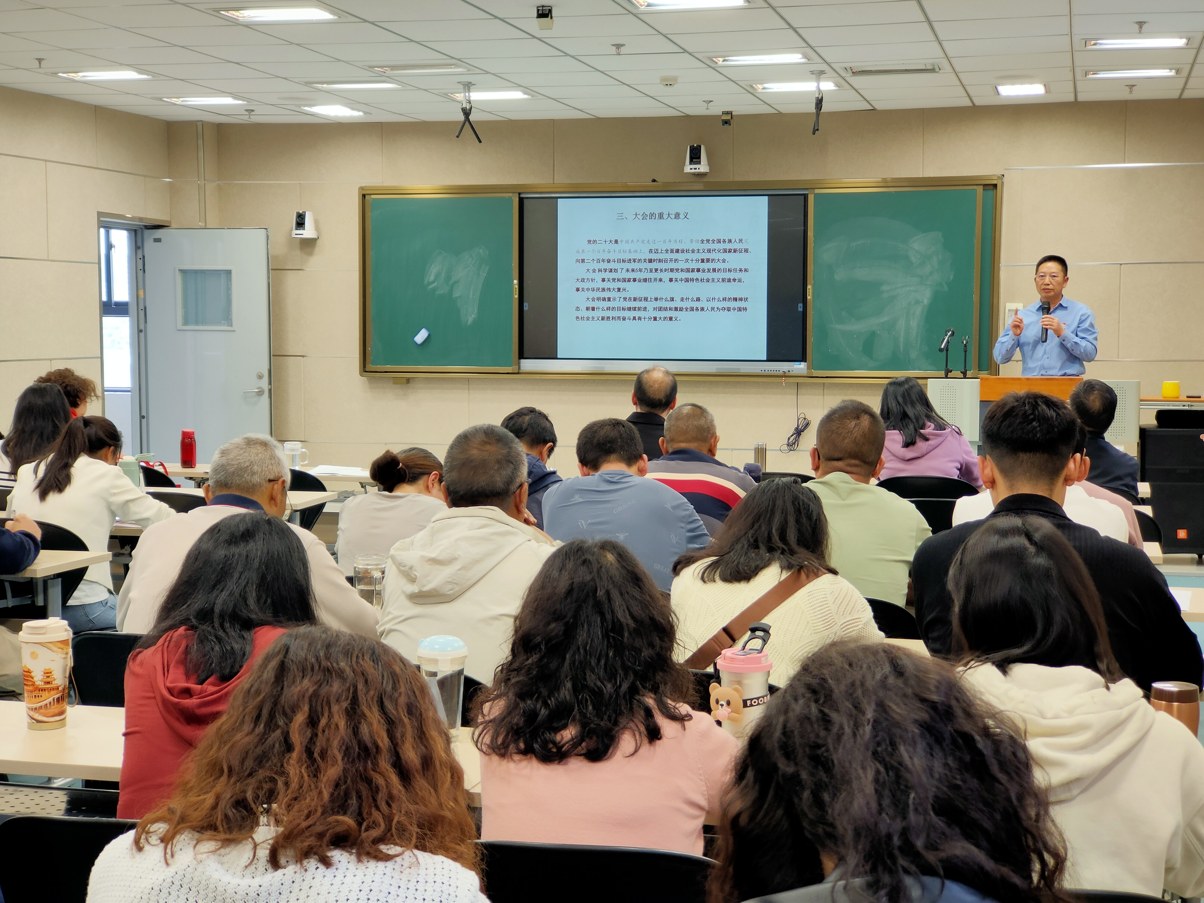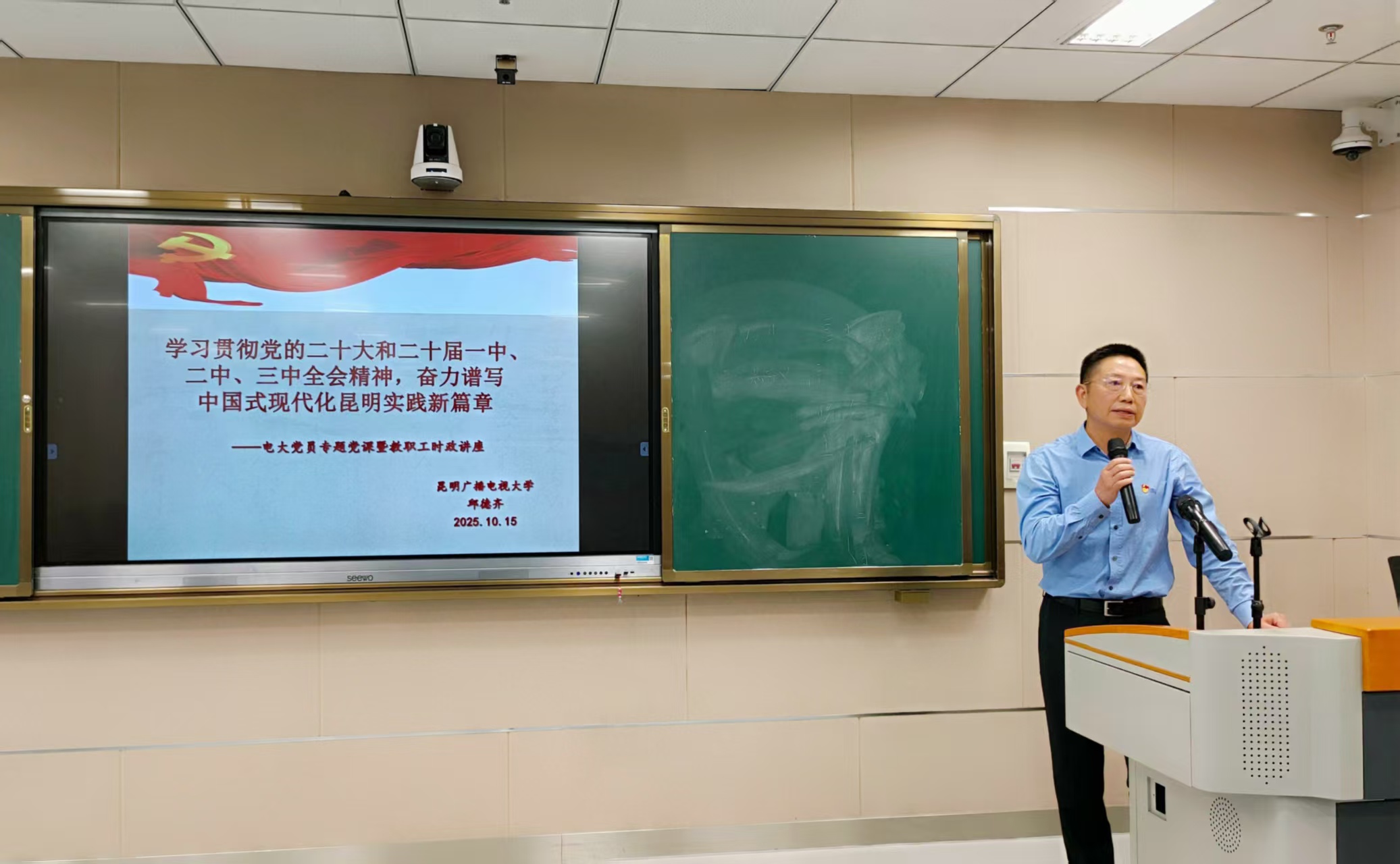 为组织学校党员和教职工贯通学习党的二十大和二十届一中、二中、三中全会精神,习近平总书记考察云南重要讲话精神,以及省委市委有关工作部署,迎接党的二十届四中全会召开,2025年10月15日,昆明广播电视大学举办了《学习贯彻党的二十大和二十届一中、二中、三中全会精神,奋力谱写中国式现代化昆明实践新篇章》的专题党课暨时政讲座。学校党总支书记邱德齐主讲了党课(讲座),全校在职党员和教职工参加了学习。