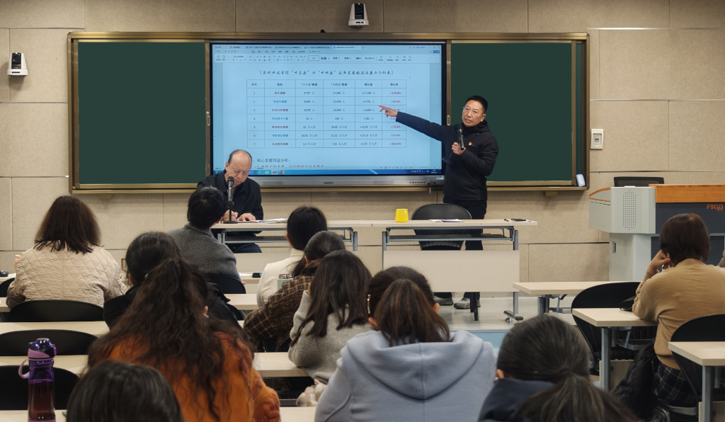 邱德齐结合党的二十届四中全会《公报》《建议》内容,宣讲了我国“十五五”时期的重要地位、面临的形势以及经济社会发展的指导思想、遵循原则、主要目标和重点任务,组织学习了《建议》中有关教育工作的具体部署,报告了学校“十四五”时期事业发展情况、“十五五”规划总体思路和发展主攻方向。他指出,对比“十三五”,学校“十四五”期间“三大业务”发展实现量质同步大幅提升,“一体多元”办学格局全面巩固,服务本地经济社会发展能力显著增强:学历教育招生规模由9,787人增加到27,085 人,毕业生规模由8,663 人增加到12,428 人,年均办学规模由8,878 人增加到13,938 人,学位授予人数由1人增加到192 人;师资培训组训规模由22 万人次增加到38.68 万人次,学时登记规模由33.33 万人次增加到52.52 万人次;社老教育实体化培训规模由1.4 万人次增长到7.33 万人次。他要求,全校干部职工要认真学习领悟党的二十届四中全会精神,遵循方向把握机遇直面挑战;充分认识学校“十四五”发展取得的成就,树立对未来发展的必胜信心;积极为学校发展建言献策,协力做好学校“十五五”规划编制和实施工作。