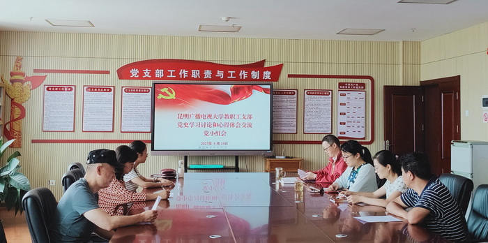 为全面推动党史学习教育走向深入,根据根据上级党组织关于在党史学习教育中召开专题组织生活会的有关要求(即专题组织生活会召开前,各党支部要组织党员开展一次集中学习讨论和心得体会交流),结合学校党史学习教育《实施方案》,2021年6月24日,昆明广播电视大学教职工党支部以党小组会形式,组织开展了党员党史学习讨论和心得体会交流。