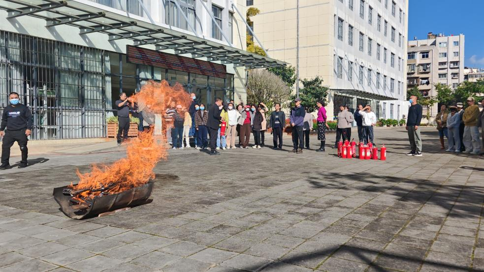 2.灭火器实操教学:在昆仑保安公司消防安全培训员的指导下,学校教职工代表亲手操作了干粉灭火器,对模拟火源进行了扑灭演练。